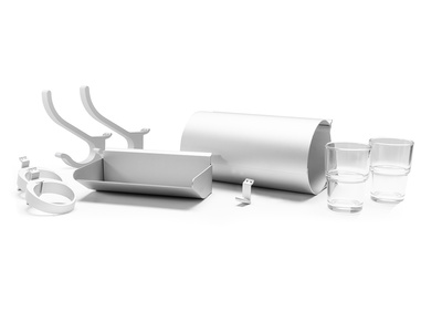 1x Papierrollenhalter, 1x Ablage silber, 2x Glashalter silber, 2x Glas, 2x Garderobenhaken silber, 1x Haken silber