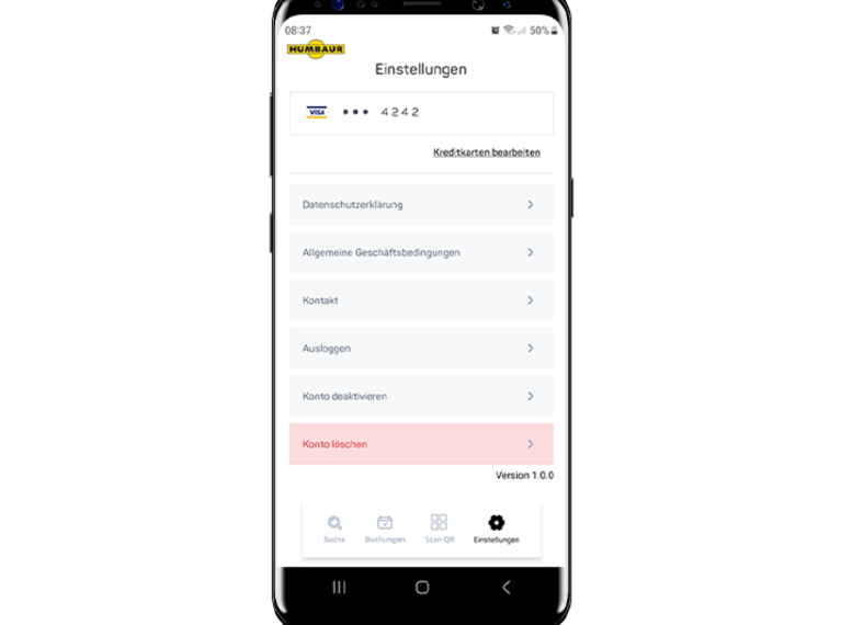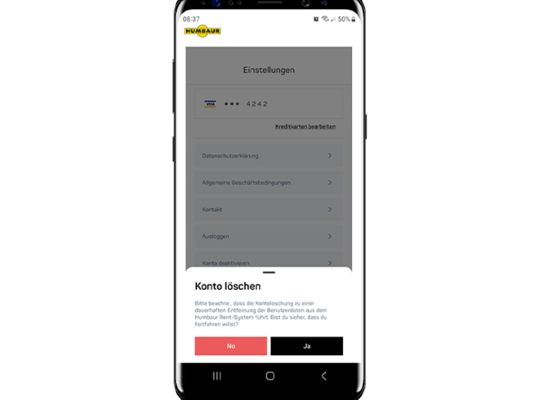 Bestätige die Kontolöschung und die dauerhafte Entfernung der Benutzerdaten aus dem Humbaur-Rent-System mit "Ja".