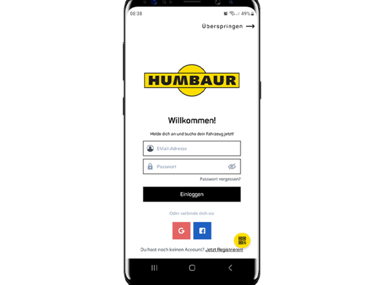 Melde dich über Google, Facebook, Apple oder deinen selbst angelegten Account in der App Humbaur Rent 24/7 an.
